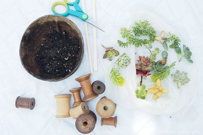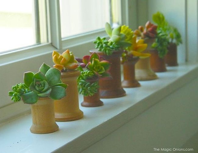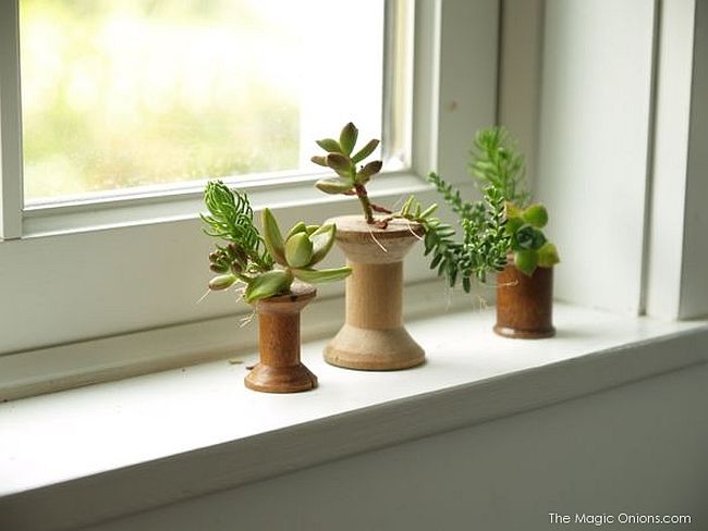 14. Utiliza viejos carretes de hilos para utilizarlos como pequeñas macetas para plantas suculentas.