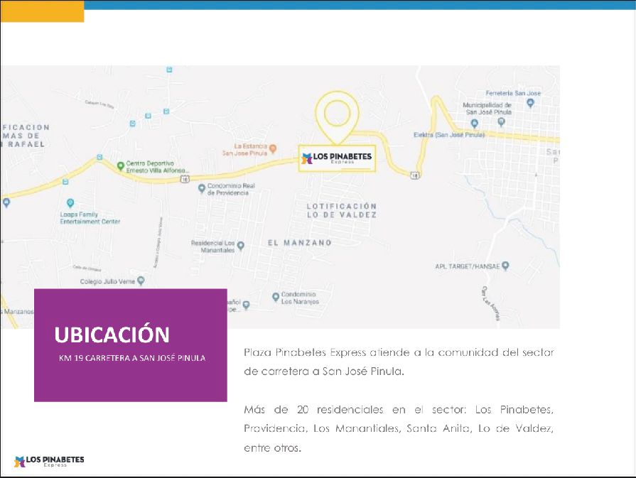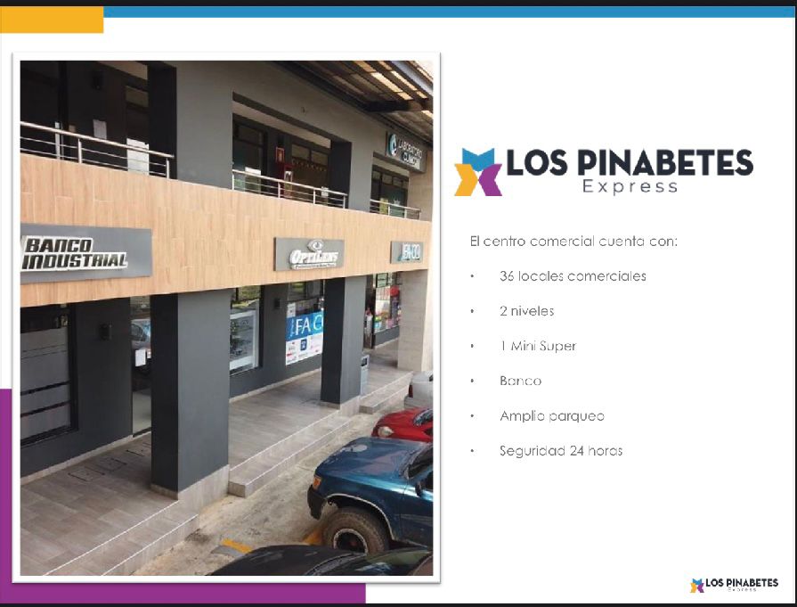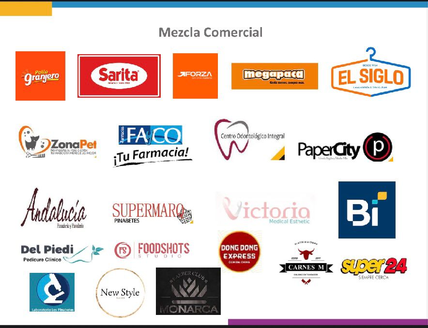 – Plaza con 36 locales comerciales, 2 niveles y mezcla de marcas reconocidas (Super 24, Sarita, Pollo Granjero, Banco Industrial, Megapaca, farmacias, clínicas, panaderías y más)